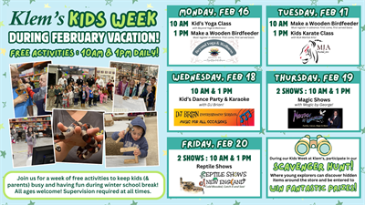 During our Kids Week at Klem’s, participate in our SCAVENGER HUNT! Where young explorers can discover hidden items around the store and be entered to WIN FANTASTIC PRIZES! Time to break out those binoculars! What will YOU find? Good Luck!